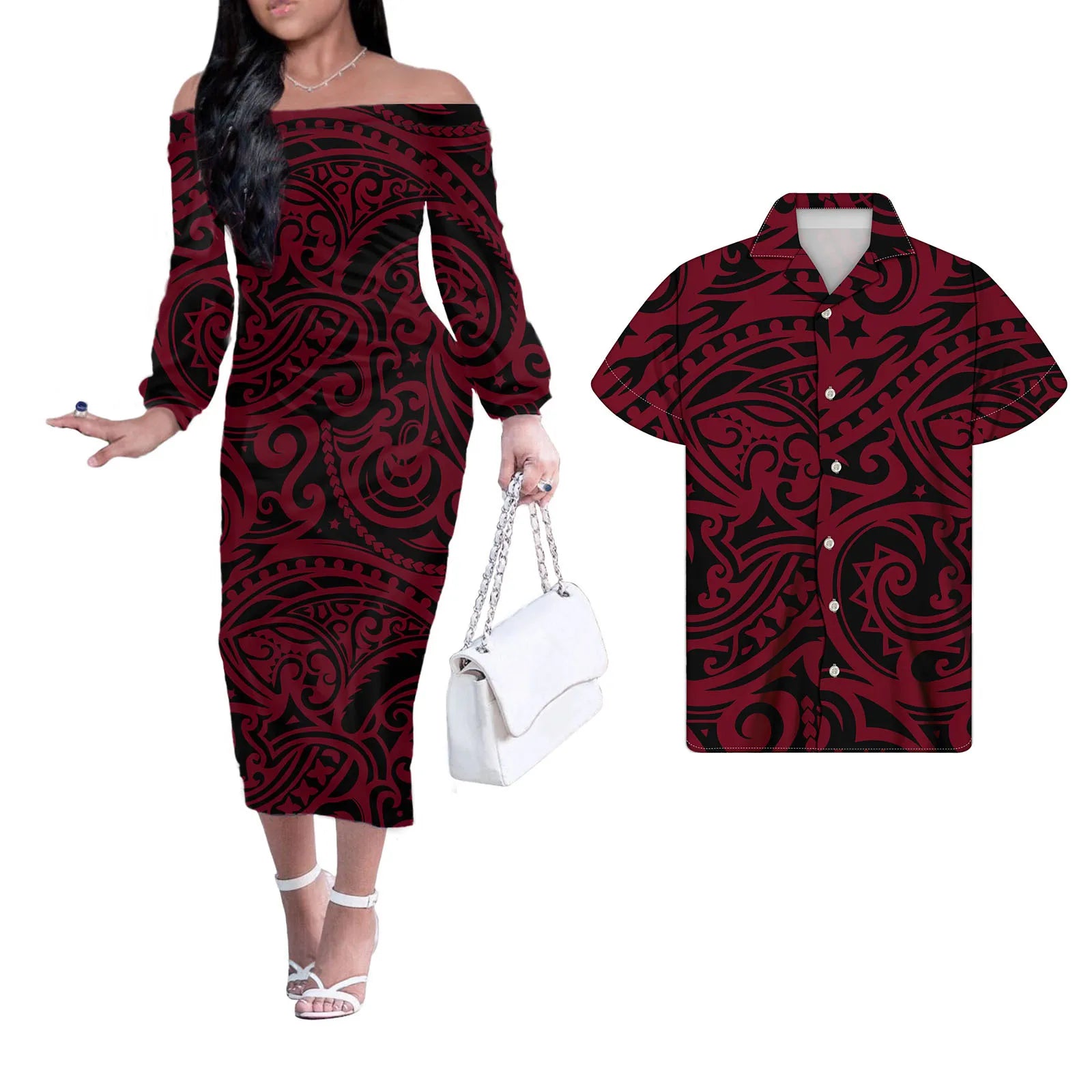 Red Polynesian Tribal Pattern Matching Outfit For Couples Men Shirts and Birthday Dress Off Shoulder Long Dresses for Women