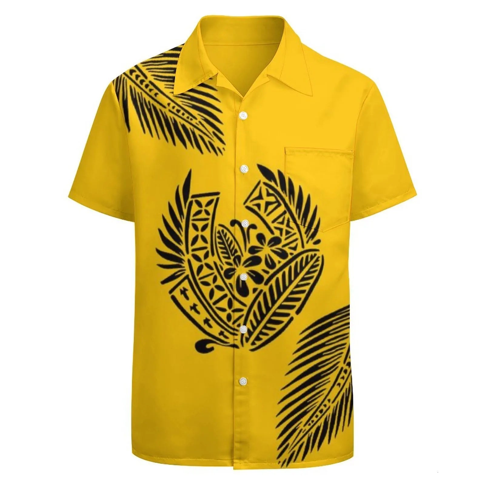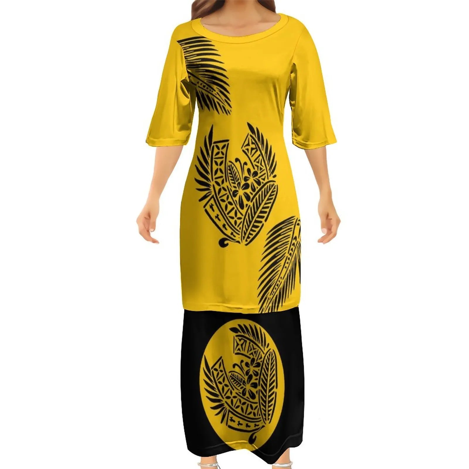 Yellow Tropical Polynesian Traditional Tribal Couple Set Puletasi Dress Two-Piece Suit With Men's Shirt Blue Matching Outfit For Couple